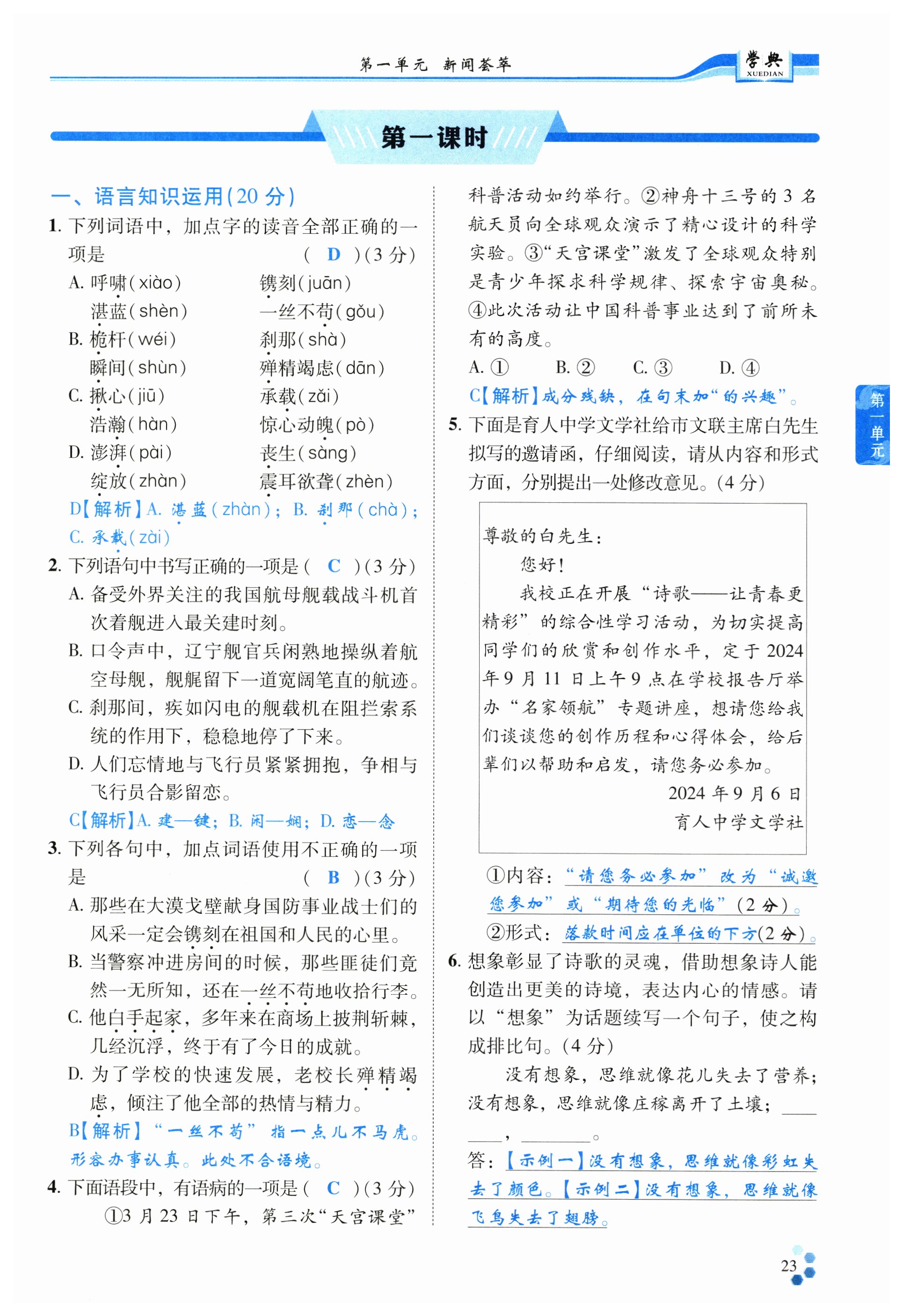 注:目前有些书本章节名称可能整理的还不是很完善,但都是按照顺序排列的,请同学们按照顺序仔细查找。练习册 2024年学典四川八年级语文上册人教版 答案主要是用来给同学们做完题方便对答案用的,请勿直接抄袭。