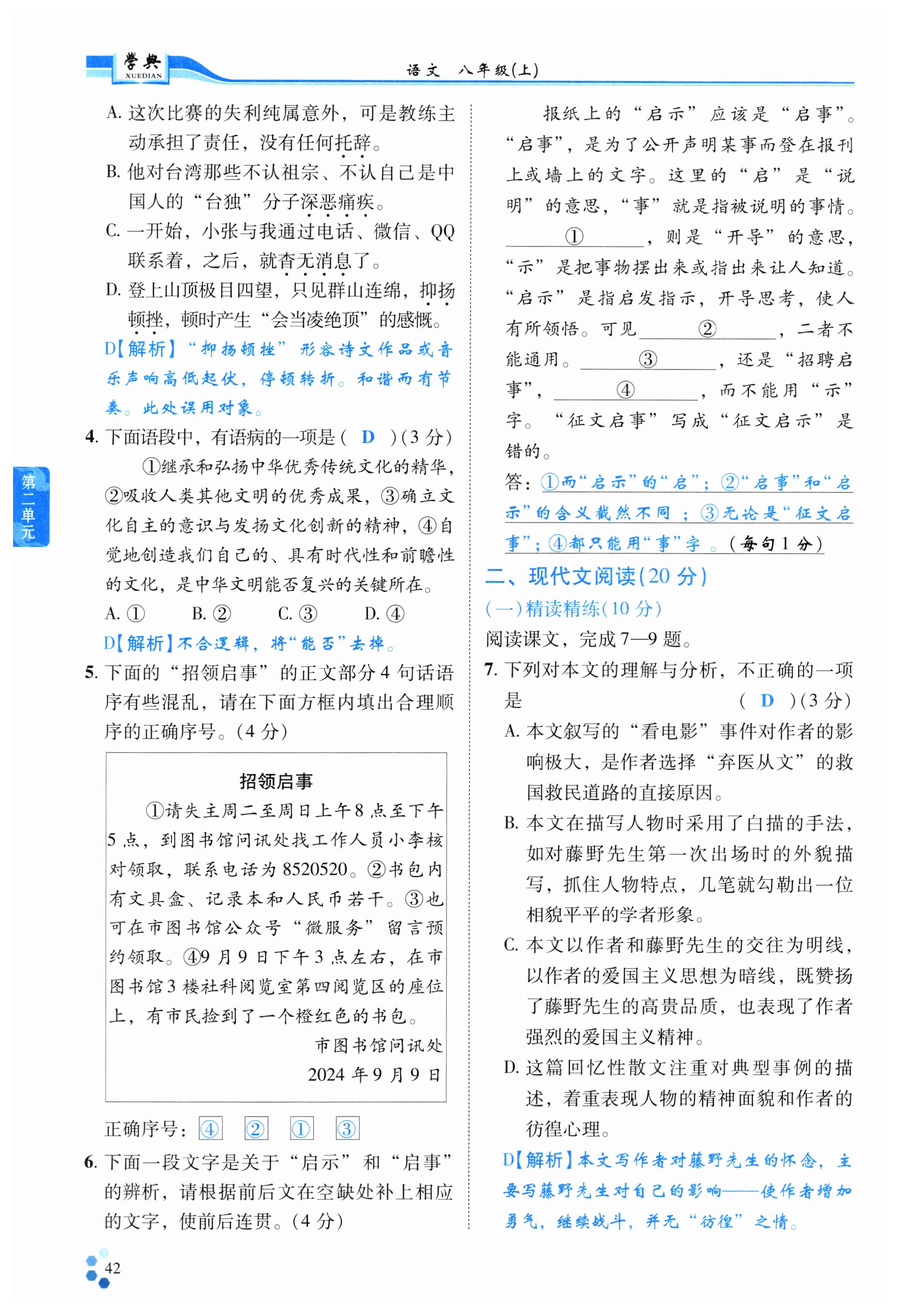 注:目前有些书本章节名称可能整理的还不是很完善,但都是按照顺序排列的,请同学们按照顺序仔细查找。练习册 2024年学典四川八年级语文上册人教版 答案主要是用来给同学们做完题方便对答案用的,请勿直接抄袭。
