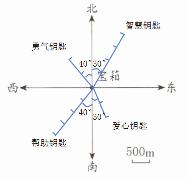 (4)“帮助钥匙”在宝箱的南偏西40°方向上,距宝箱2km。