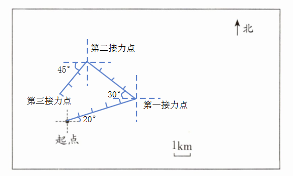 下面是某地老年运动会骑自行车环湖接力赛中的一段赛程:1号选手从起点沿东偏北 $20^{\circ}$ 方向行 $5\mathrm{km}$ 到达第一接力点;2号选手从第一接力点沿西偏北 $30^{\circ}$ 方向行 $4\mathrm{km}$ 到达第二接力点;3号选手从第二接力点沿西偏南 $45^{\circ}$ 方向行 $3\mathrm{km}$ 到达第三接力点。