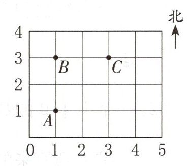 (1)如右图,每个小正方形对角线的长是20m,点A的位置是$(1,1)$,点C在点A( )偏( )( )方向( )m处,点B南偏东$45^{\circ}$方向60m处是点( , )。
