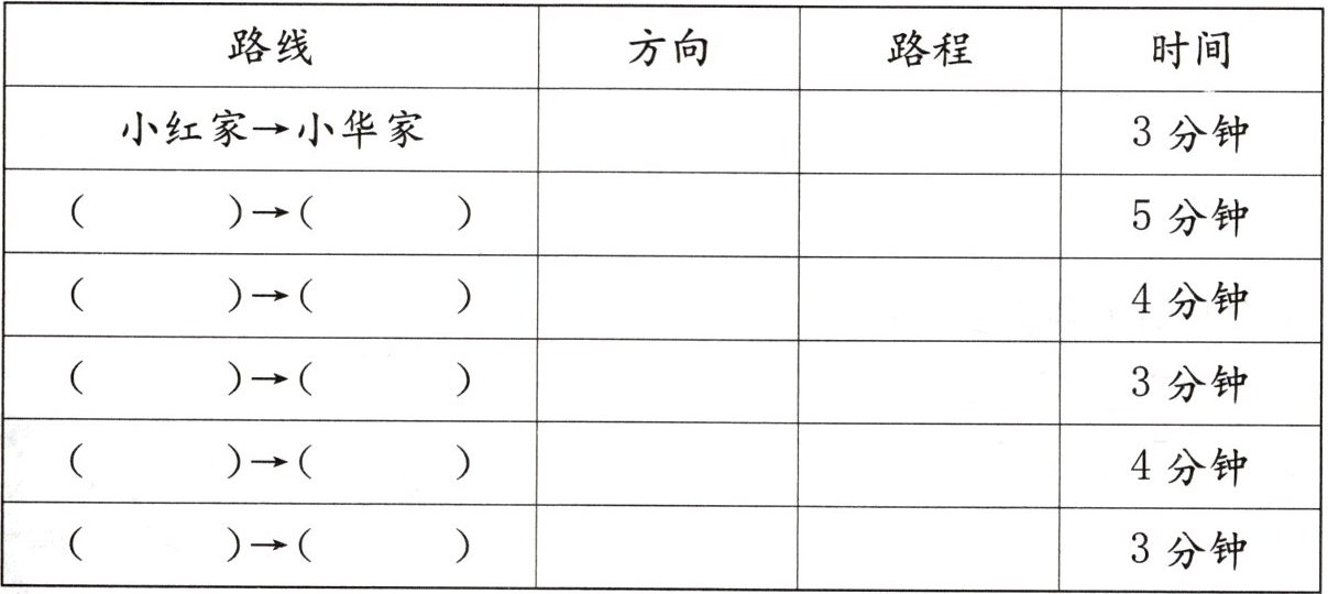 (1)根据路线图,说一说小红骑自行车从家去书店和按原路返回时所走的方向和路程,完成下表。