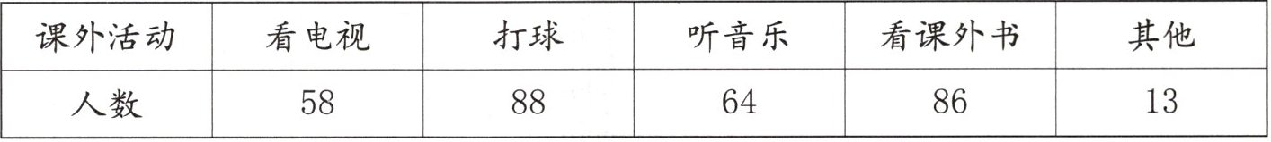 | 课外活动 | 看电视 | 打球 | 听音乐 | 看课外书 | 其他 |
