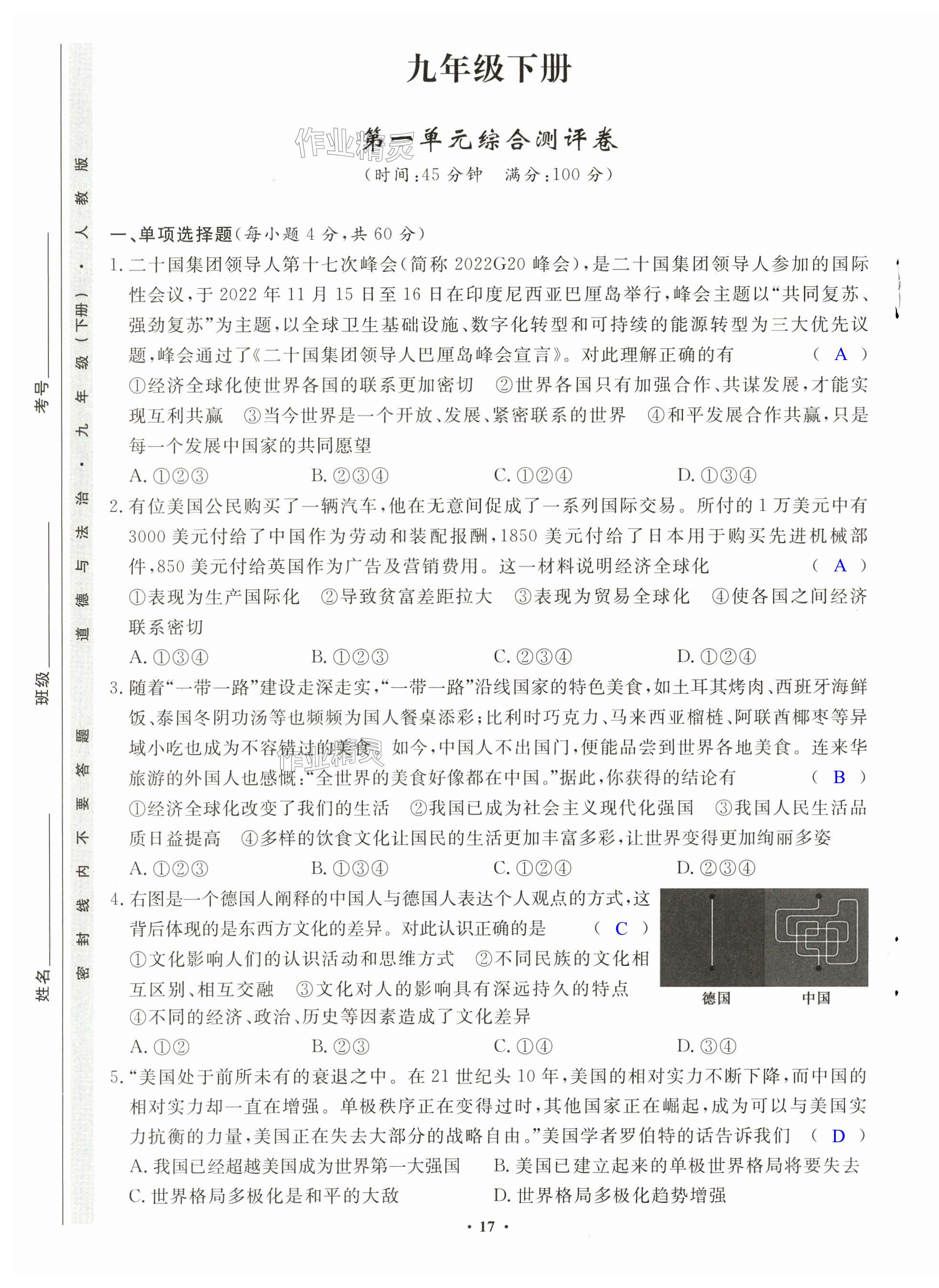 注:目前有些书本章节名称可能整理的还不是很完善,但都是按照顺序排列的,请同学们按照顺序仔细查找。练习册 2024年学生成长册九年级道德与法治全一册人教版 答案主要是用来给同学们做完题方便对答案用的,请勿直接抄袭。