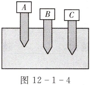 13. 探究“物体的重力势能大小与哪些因素有关”的实验中,三个相同的木桩被从空中静止释放的铁块撞击,陷入沙坑中的情况如图12-1-4所示。在此实验中,我们是通过观察什么来比较各铁块重力势能的大小?