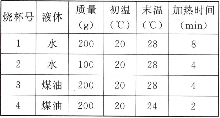 |烧杯号|液体|质量(g)|初温($^{\circ}C$)|末温($^{\circ}C$)|加热时间(min)|