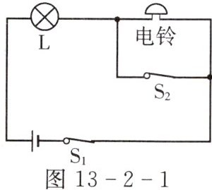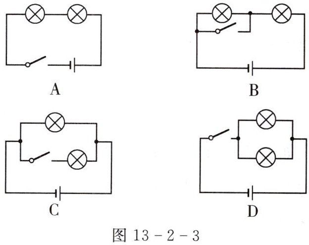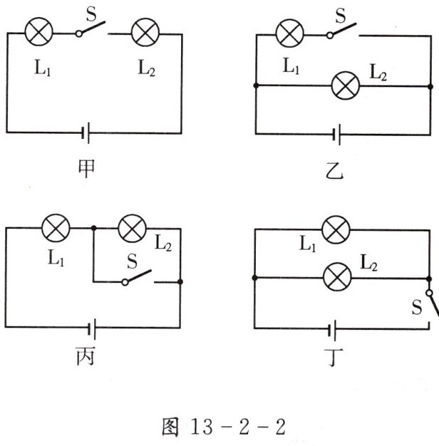 5. 如图13-2-2所示的四个电路图中,开关能使$L_1、$$L_2$两盏灯同时发光和熄灭的是( )