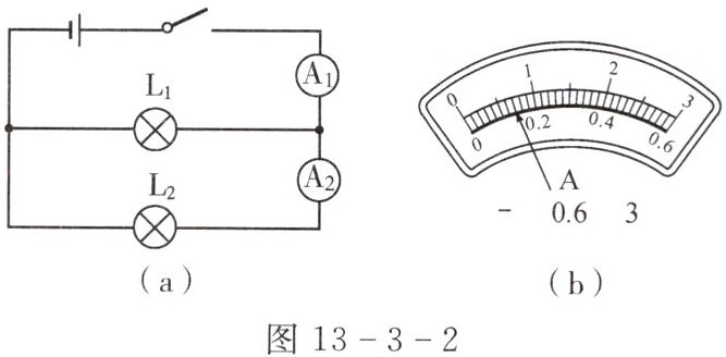 4. 在“用电流表测电流”的实验中,某同学接成如图13-3-2(a)所示的电路。当开关闭合后,两灯都发光,两个电流表的指针所指位置均为图(b)所示,则通过灯$L_1$的电流为______A,通过灯$L_2$的电流为______A。