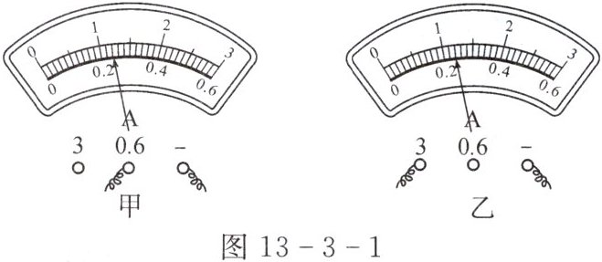 3. 如图13-3-1所示是同一个电流表的表盘在两次测电流时指针所指的位置,那么甲图所示的电流表的量程是______,此时电流表的示数是______;乙图所示的电流表的量程是______,此时电流表的示数是______。