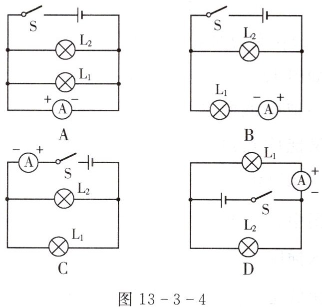 6. 如图13-3-4所示的四个电路图中,电流表能测量并联电路中通过灯$L_1$电流的是( )