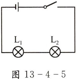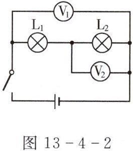 4. 如图13-4-2所示,当开关闭合后,两灯都发光,此时$V_1、$$V_2$表的读数分别是4 V和2.5 V,则电源电压为______V,灯$L_1$两端的电压为______V,灯$L_2$两端的电压为______V。