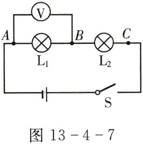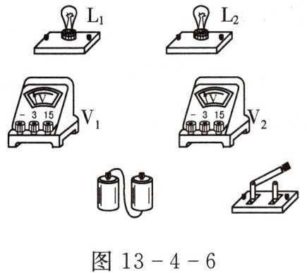 9. 将图13-4-6中的元件用笔画线连接起来,要求:灯泡$L_1$与$L_2$串联,电压表$V_1$测$L_1$两端的电压$,V_2$测$L_2$两端的电压。