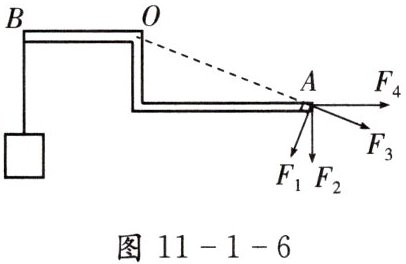 10. 如图 11-1-6 所示,杠杆 AOB 可以绕 O 点转动,现在它的 B 点挂一重物 G,为了使它静止,可以在 A 点施加不同方向的力,图中四个方向中力臂最大的是( )