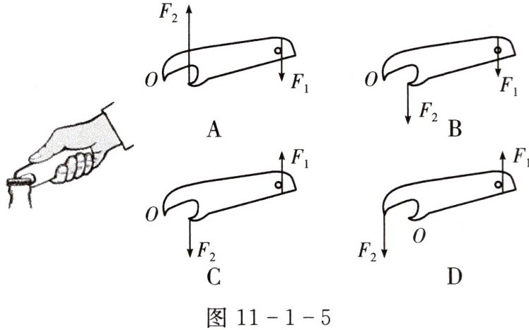 9. 如图 11-1-5 所示,图中能正确表示开瓶盖时,杠杆的支点、动力和阻力的是( )