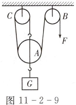 14. 如图11-2-9所示装置,滑轮A重40 N,滑轮B、C各重20 N,重物$G= 200\ N$。若:不计拉绳质量及滑轮转动摩擦影响,绳自由端在力F作用下,恰能以60 mm/s向下运动,则力F的大小是多少?重物G在1 min内能上升多少距离?(绳子足够长)