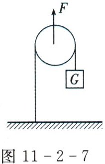 12. 如图11-2-7所示,不计动滑轮的质量及转动摩擦,当竖直向上的力$F= 10\ N$时,恰能使重物G匀速上升,则重物$G= $______N,绳固定端拉力为______N,重物上升10 cm,力F向上移动______cm。