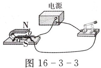 16. 小丽同学“探究通电导体在磁场中受力方向与什么因素有关”,如图16-3-4所示。当她闭合开关S₀时,观察到导体AB在磁场中受力的作用向右运动;断开开关S₀,只将磁铁N、S极对调位置,再次闭合开关S₀时,观察到导体AB在磁场中受力的作用向左运动。由此小丽得出结论:“通电导体在磁场中受力方向只与磁场方向有关”,请你选用如图所示电路中的元件,设计一个实验证明小丽这个观点是错误的,并简述实验步骤和实验现象。