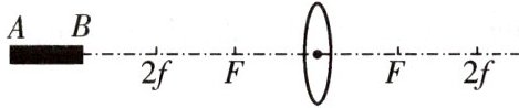 7. 在凸透镜 2 倍焦距以外的地方,沿主光轴方向平放一根粗细均匀的棒 AB,如图所示,则形成的像 $ A'B' $ 为( )
