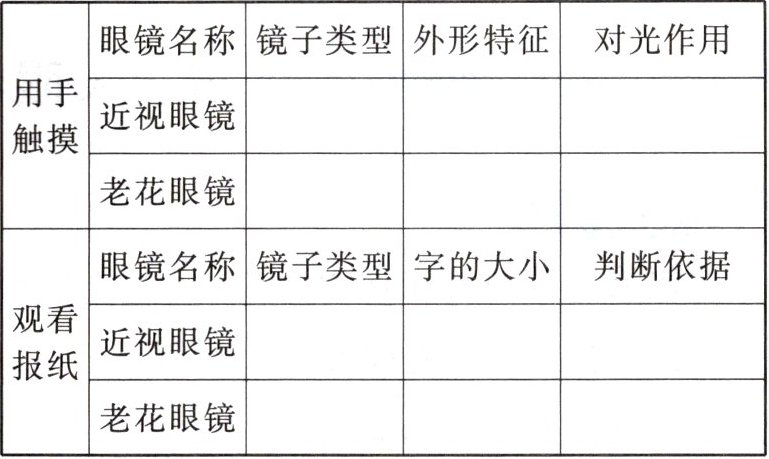 10. 芳芳的爸爸是近视眼,要戴近视眼镜矫正;爷爷是远视眼,要戴老花眼镜矫正,爸爸和爷爷的眼镜外形一模一样。有一天,两只眼镜放在一起无法判别。于是,芳芳设计了以下两种方法来辨别。请你帮她完成下列表格的填空: