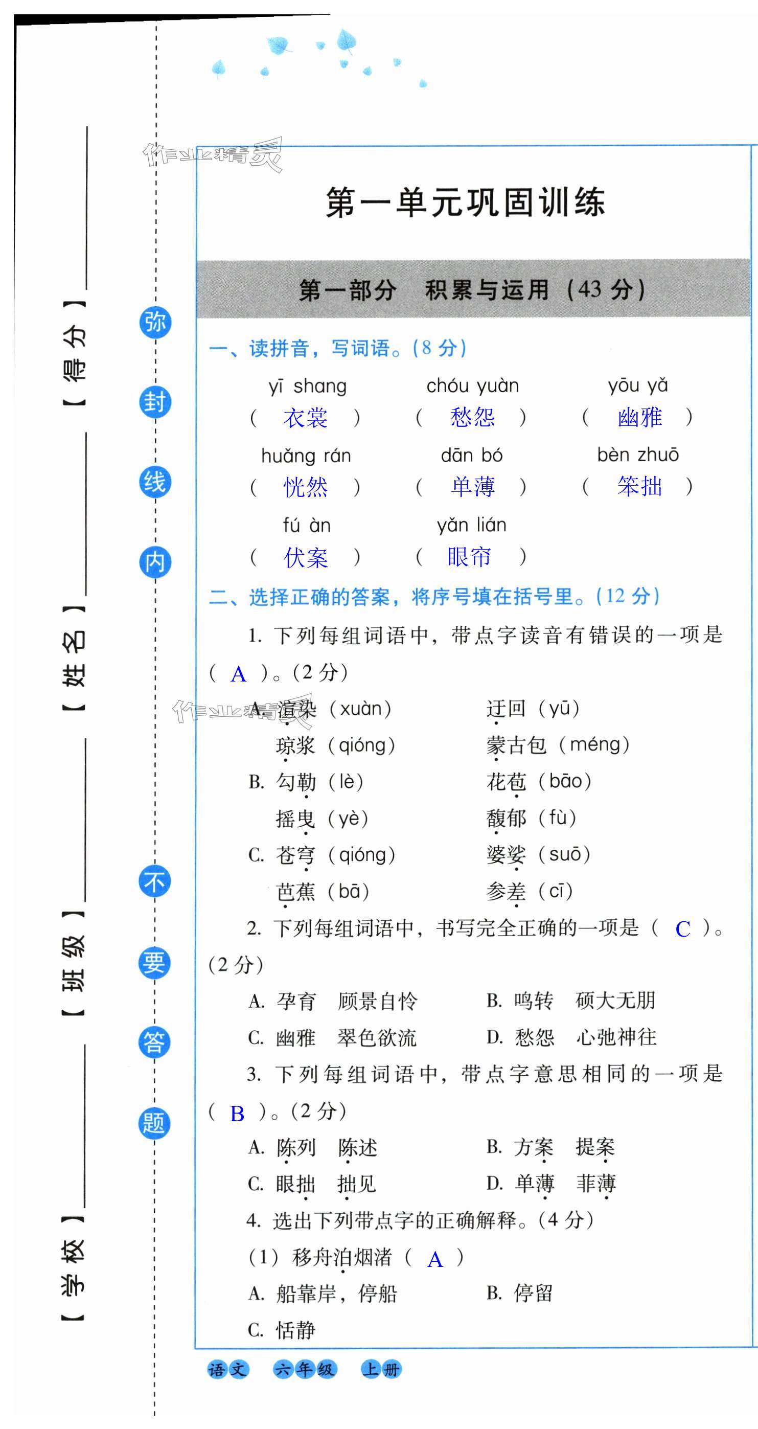 注:目前有些书本章节名称可能整理的还不是很完善,但都是按照顺序排列的,请同学们按照顺序仔细查找。练习册 2024年云南省标准教辅同步指导训练与检测配套测试卷六年级语文上册人教版 答案主要是用来给同学们做完题方便对答案用的,请勿直接抄袭。