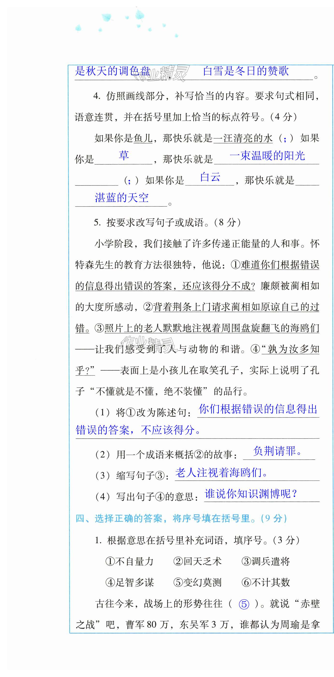 注:目前有些书本章节名称可能整理的还不是很完善,但都是按照顺序排列的,请同学们按照顺序仔细查找。练习册 2024年云南省标准教辅同步指导训练与检测配套测试卷六年级语文上册人教版 答案主要是用来给同学们做完题方便对答案用的,请勿直接抄袭。