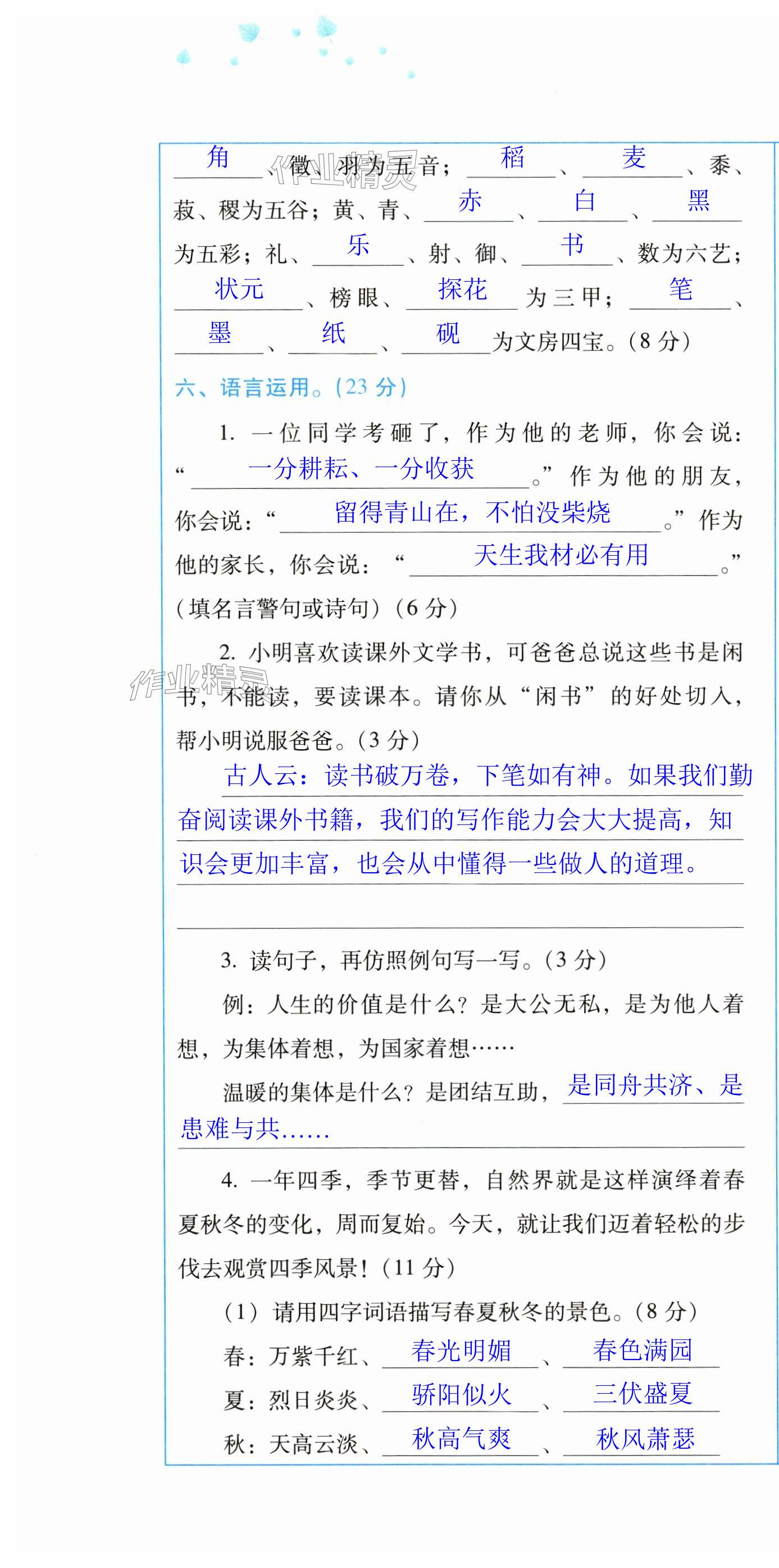 注:目前有些书本章节名称可能整理的还不是很完善,但都是按照顺序排列的,请同学们按照顺序仔细查找。练习册 2024年云南省标准教辅同步指导训练与检测配套测试卷六年级语文上册人教版 答案主要是用来给同学们做完题方便对答案用的,请勿直接抄袭。