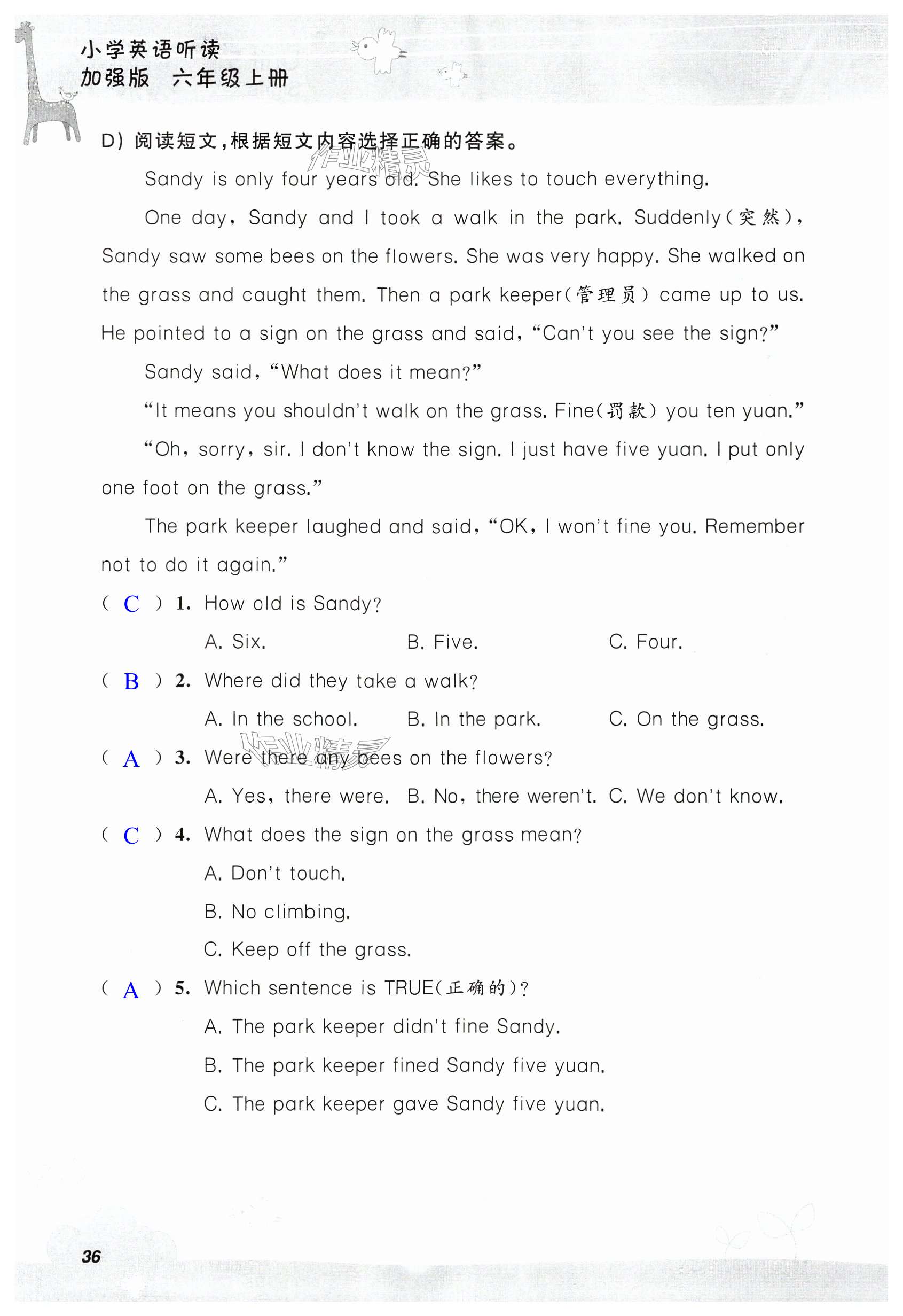 注:目前有些书本章节名称可能整理的还不是很完善,但都是按照顺序排列的,请同学们按照顺序仔细查找。练习册 2024年听读教室小学英语听读六年级上册译林版加强版 答案主要是用来给同学们做完题方便对答案用的,请勿直接抄袭。