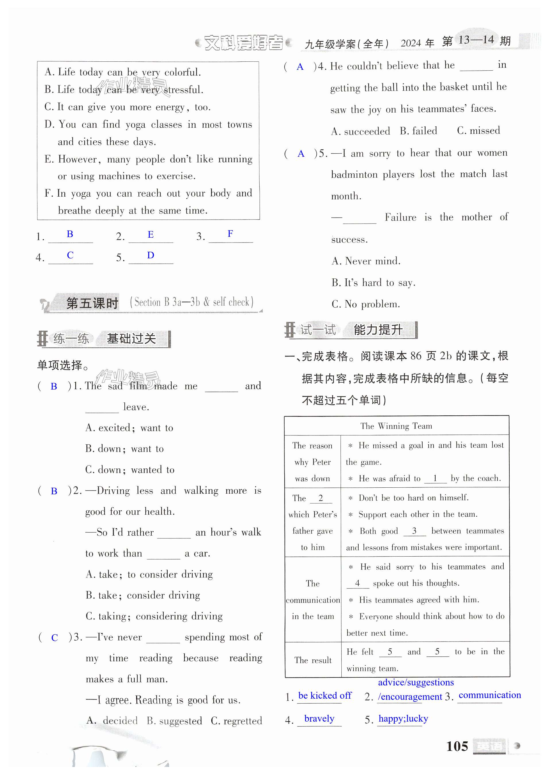 注:目前有些书本章节名称可能整理的还不是很完善,但都是按照顺序排列的,请同学们按照顺序仔细查找。练习册 2024年文科爱好者九年级英语全一册人教版 答案主要是用来给同学们做完题方便对答案用的,请勿直接抄袭。
