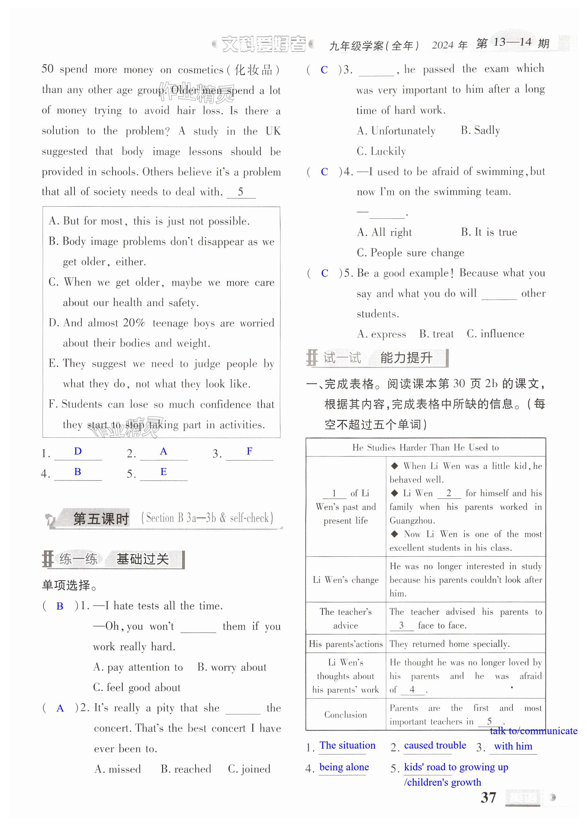 注:目前有些书本章节名称可能整理的还不是很完善,但都是按照顺序排列的,请同学们按照顺序仔细查找。练习册 2024年文科爱好者九年级英语全一册人教版 答案主要是用来给同学们做完题方便对答案用的,请勿直接抄袭。