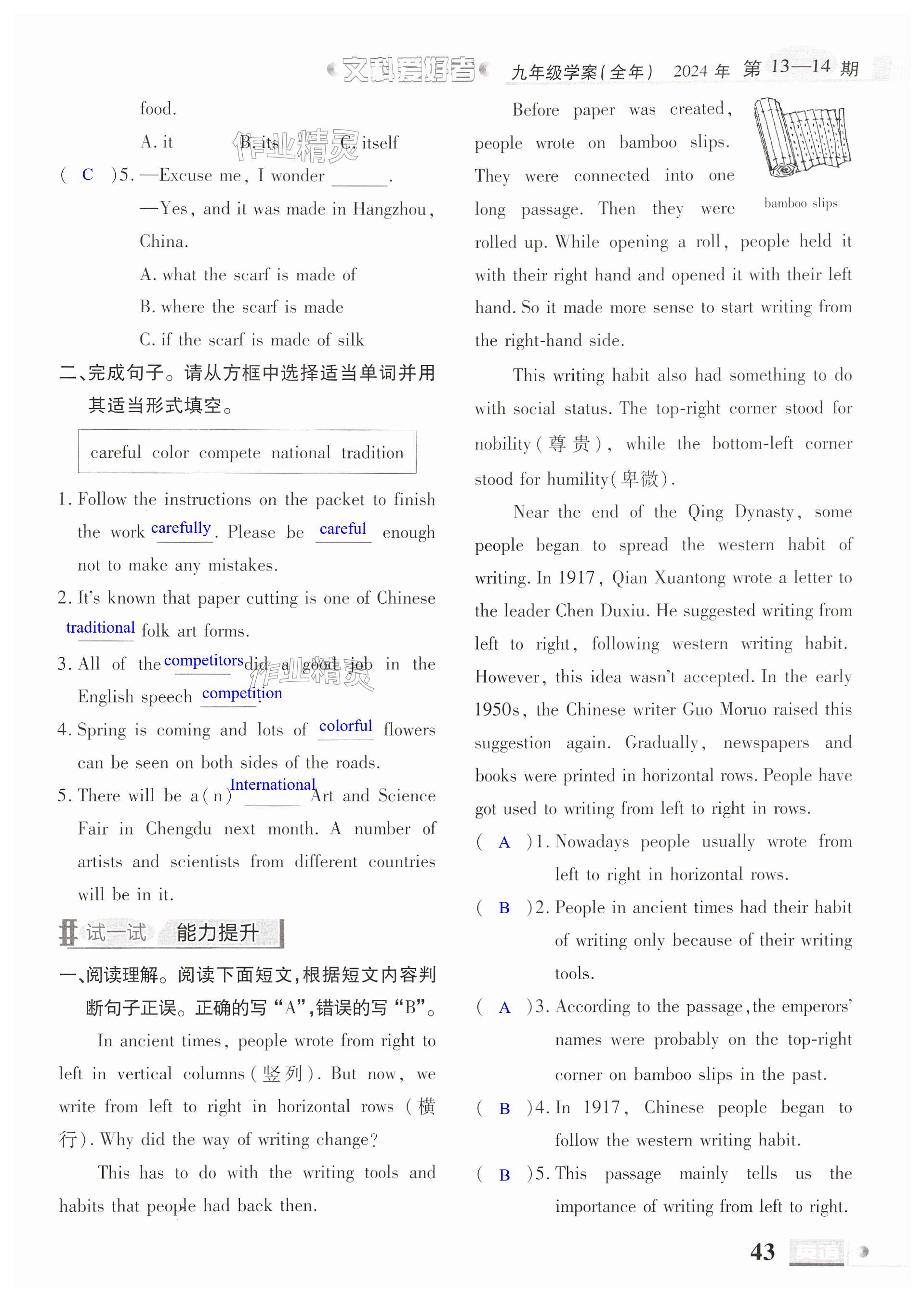 注:目前有些书本章节名称可能整理的还不是很完善,但都是按照顺序排列的,请同学们按照顺序仔细查找。练习册 2024年文科爱好者九年级英语全一册人教版 答案主要是用来给同学们做完题方便对答案用的,请勿直接抄袭。