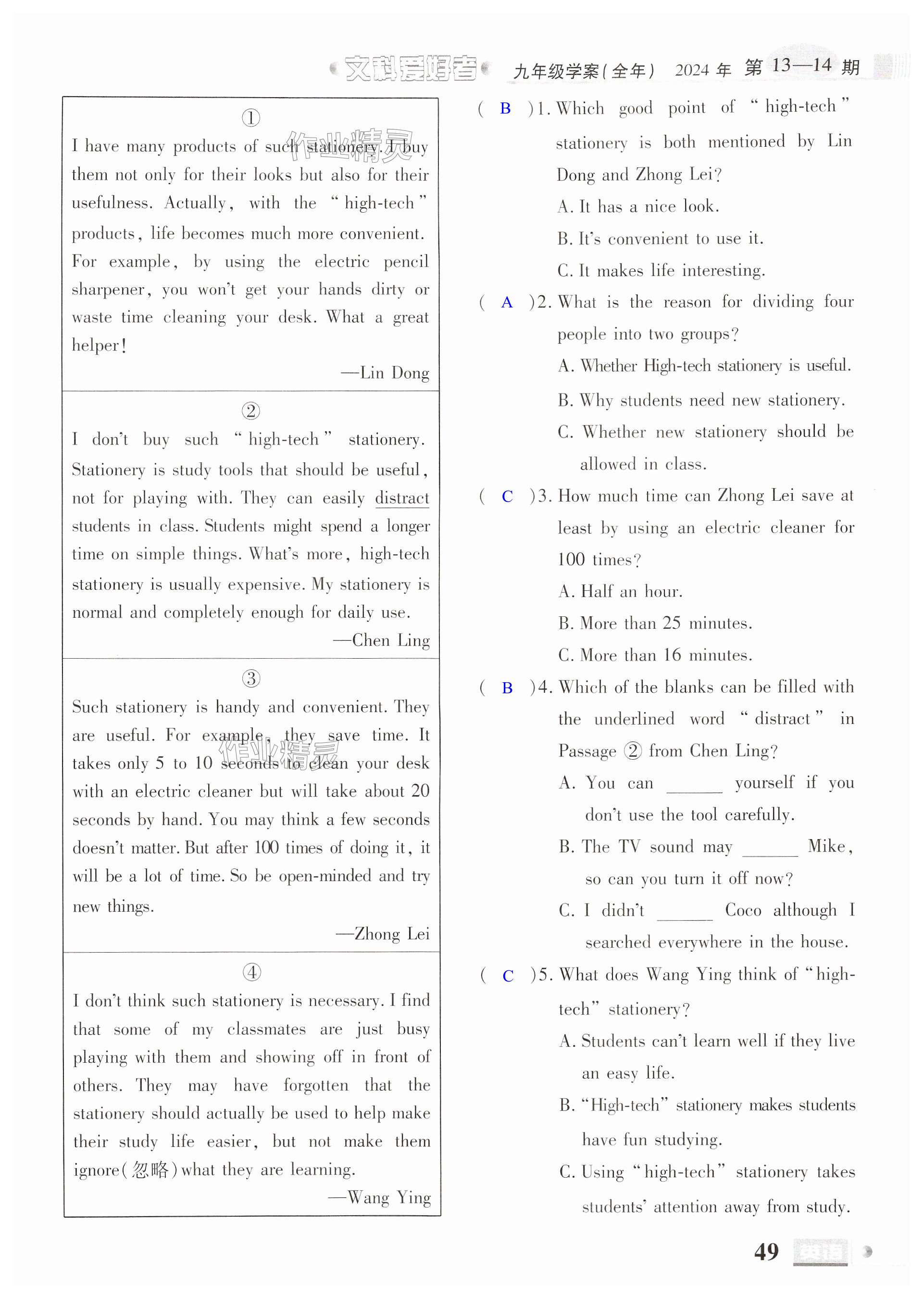 注:目前有些书本章节名称可能整理的还不是很完善,但都是按照顺序排列的,请同学们按照顺序仔细查找。练习册 2024年文科爱好者九年级英语全一册人教版 答案主要是用来给同学们做完题方便对答案用的,请勿直接抄袭。