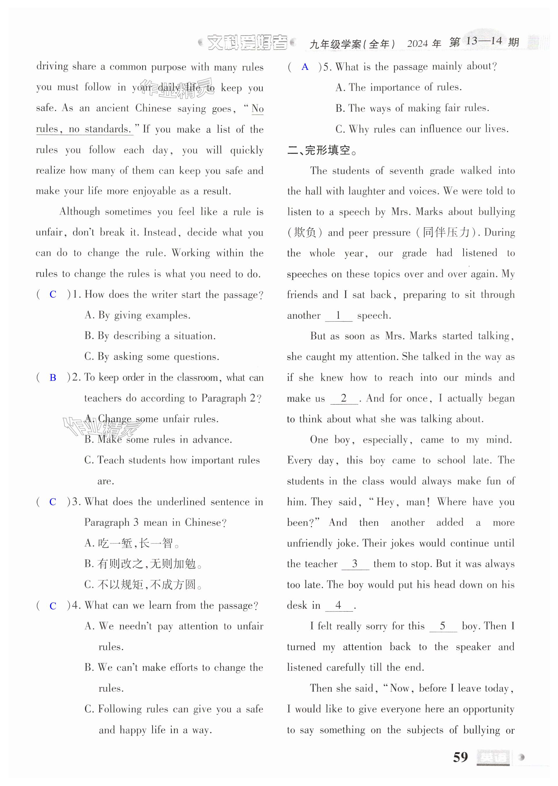 注:目前有些书本章节名称可能整理的还不是很完善,但都是按照顺序排列的,请同学们按照顺序仔细查找。练习册 2024年文科爱好者九年级英语全一册人教版 答案主要是用来给同学们做完题方便对答案用的,请勿直接抄袭。