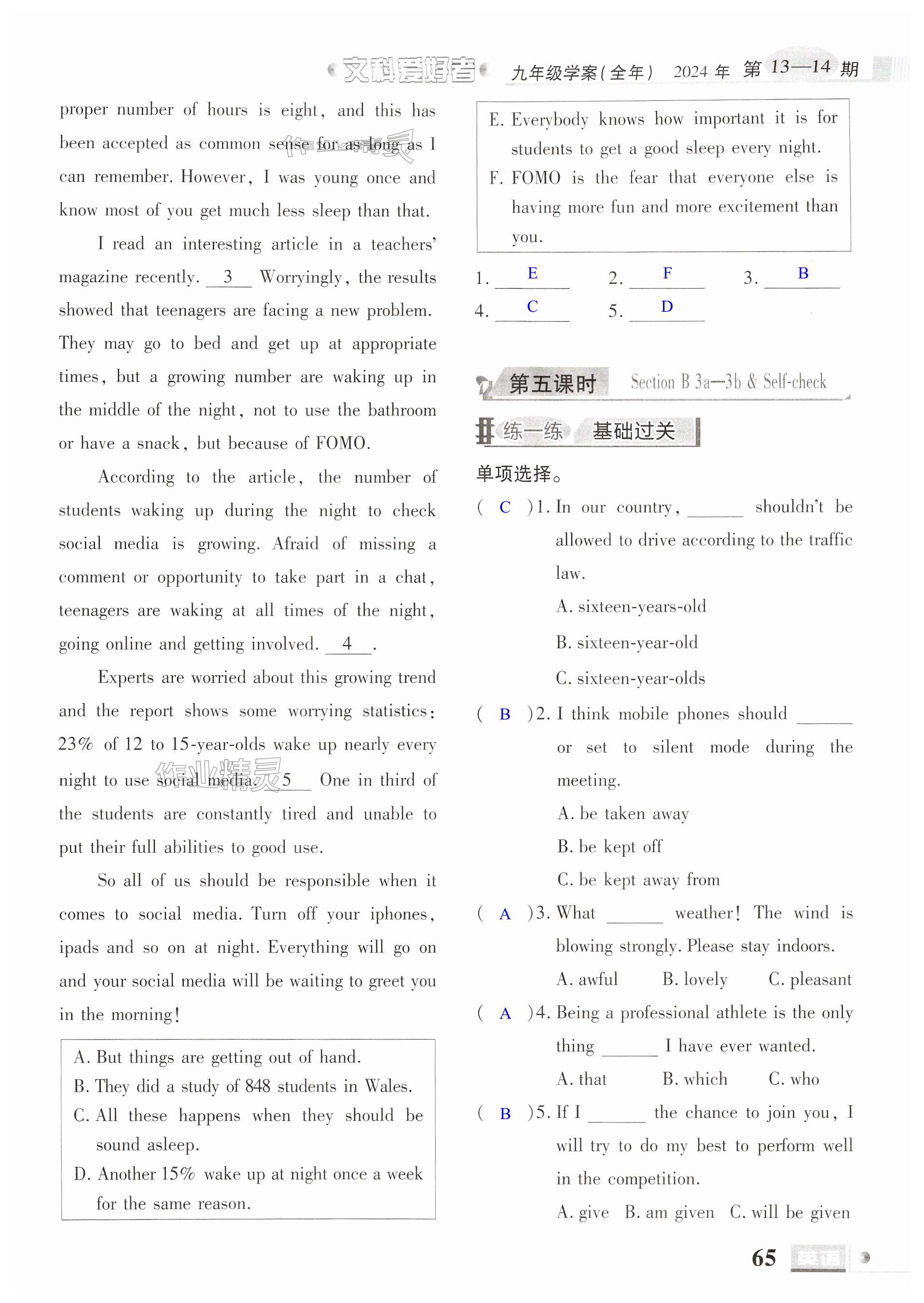 注:目前有些书本章节名称可能整理的还不是很完善,但都是按照顺序排列的,请同学们按照顺序仔细查找。练习册 2024年文科爱好者九年级英语全一册人教版 答案主要是用来给同学们做完题方便对答案用的,请勿直接抄袭。