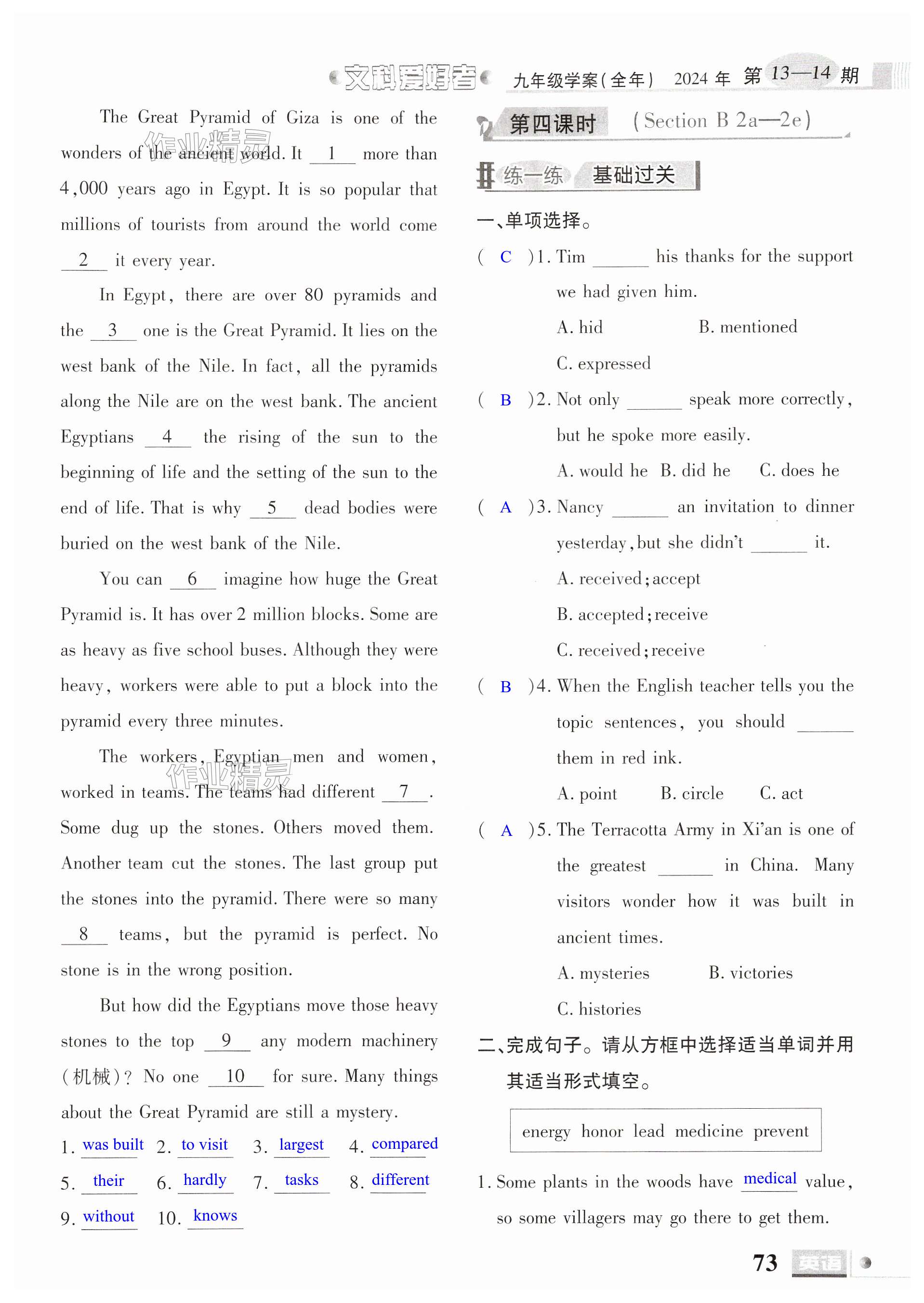 注:目前有些书本章节名称可能整理的还不是很完善,但都是按照顺序排列的,请同学们按照顺序仔细查找。练习册 2024年文科爱好者九年级英语全一册人教版 答案主要是用来给同学们做完题方便对答案用的,请勿直接抄袭。