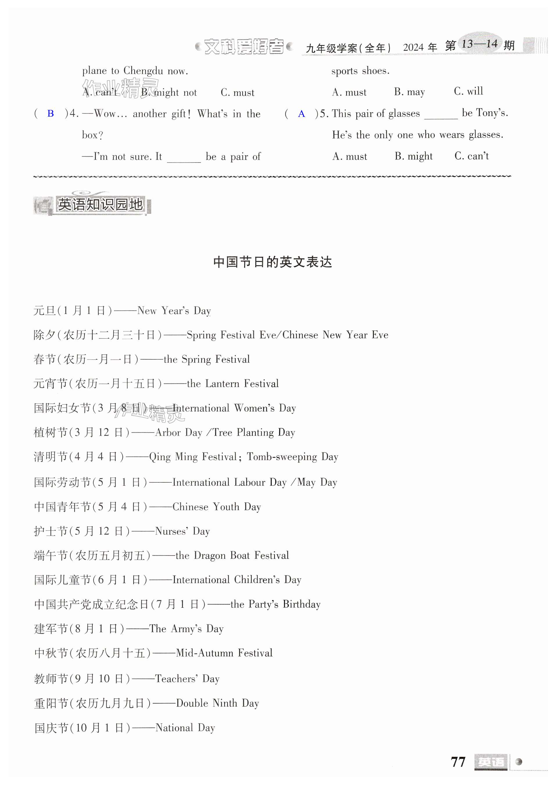 注:目前有些书本章节名称可能整理的还不是很完善,但都是按照顺序排列的,请同学们按照顺序仔细查找。练习册 2024年文科爱好者九年级英语全一册人教版 答案主要是用来给同学们做完题方便对答案用的,请勿直接抄袭。