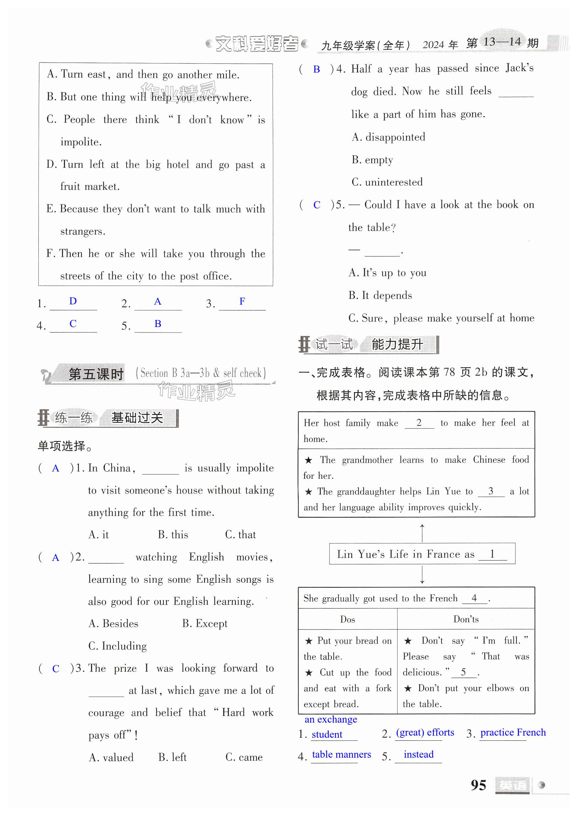 注:目前有些书本章节名称可能整理的还不是很完善,但都是按照顺序排列的,请同学们按照顺序仔细查找。练习册 2024年文科爱好者九年级英语全一册人教版 答案主要是用来给同学们做完题方便对答案用的,请勿直接抄袭。