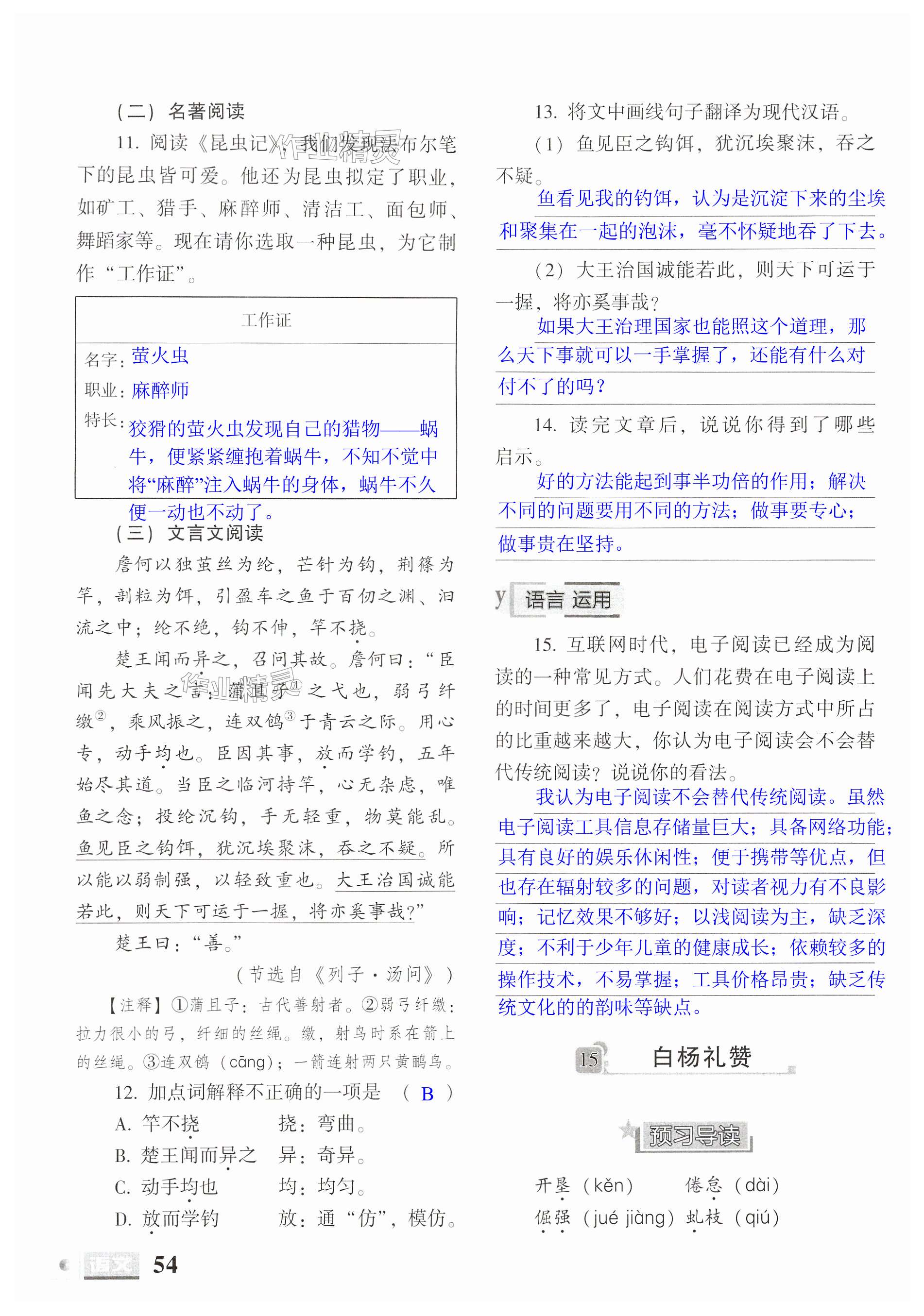 注:目前有些书本章节名称可能整理的还不是很完善,但都是按照顺序排列的,请同学们按照顺序仔细查找。练习册 2024年文科爱好者八年级语文上册人教版 答案主要是用来给同学们做完题方便对答案用的,请勿直接抄袭。