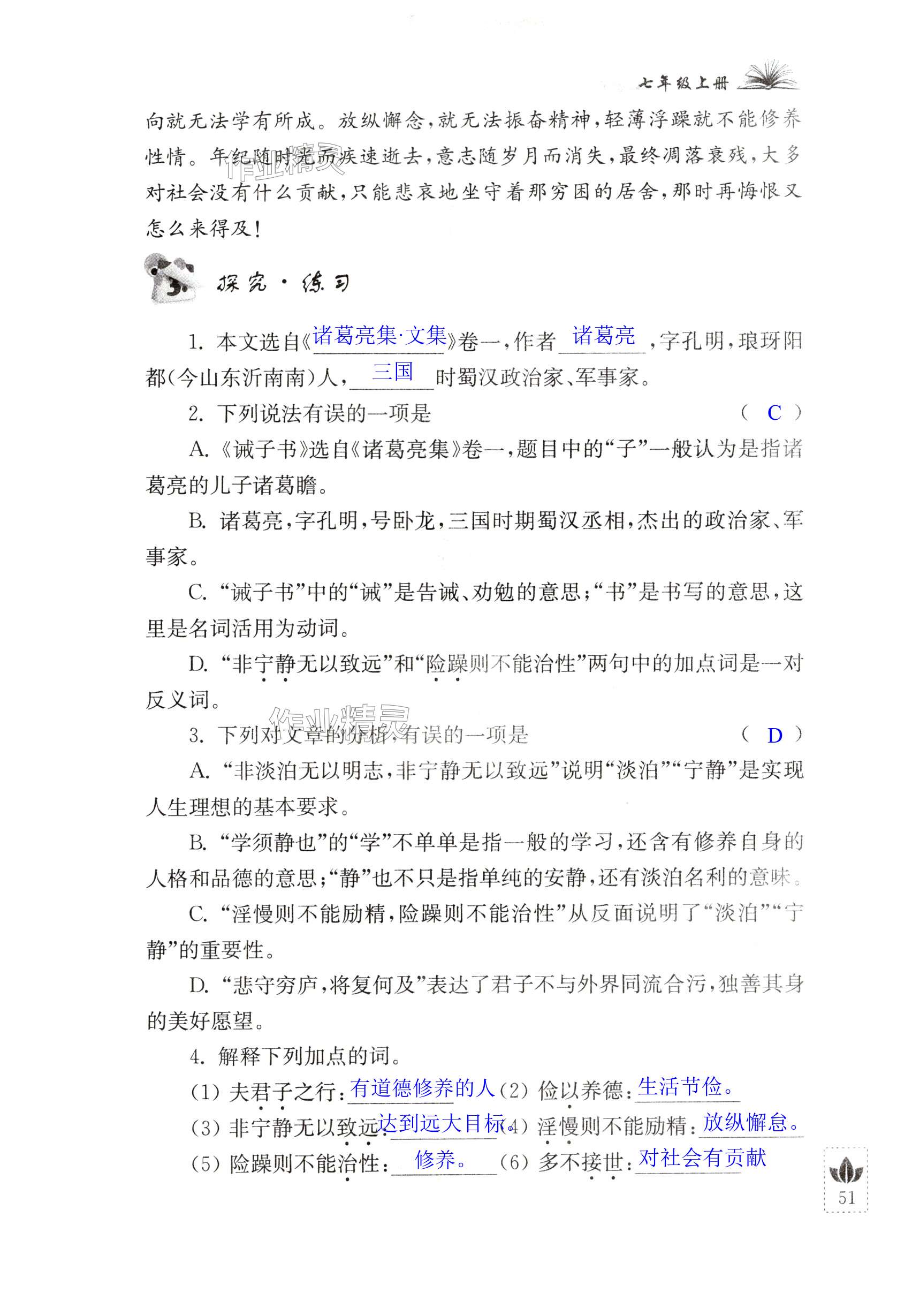 注:目前有些书本章节名称可能整理的还不是很完善,但都是按照顺序排列的,请同学们按照顺序仔细查找。练习册 2024年初中文言文全解江苏人民出版社七年级上册 答案主要是用来给同学们做完题方便对答案用的,请勿直接抄袭。