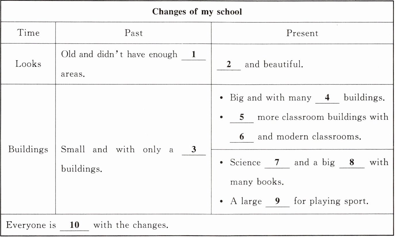 The school was small with only a few buildings. Now, there are many new buildings. We have two more classroom buildings. And the classrooms in them are bright and modern. There are science labs and a big library with many books. The library is my favourite place because I love reading.