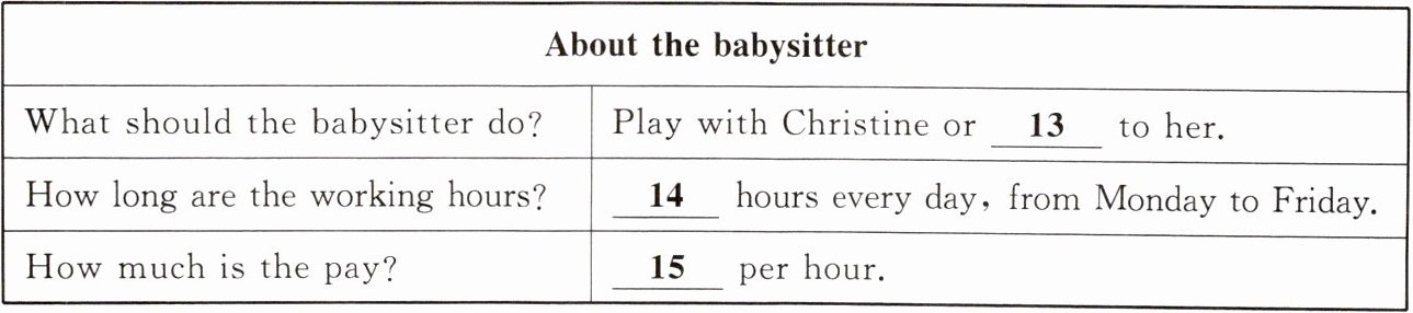 |What should the babysitter do?|Play with Christine or 13 to her.|