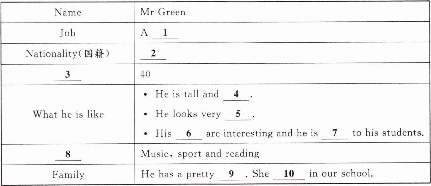 Mr Green is very “in”. He likes music. He can sing many English songs. We all like to listen to him singing. He also likes sport. He is in the school basketball team. Mr Green likes reading. We often borrow books from him. I think we are lucky to have Mr Green to teach us.