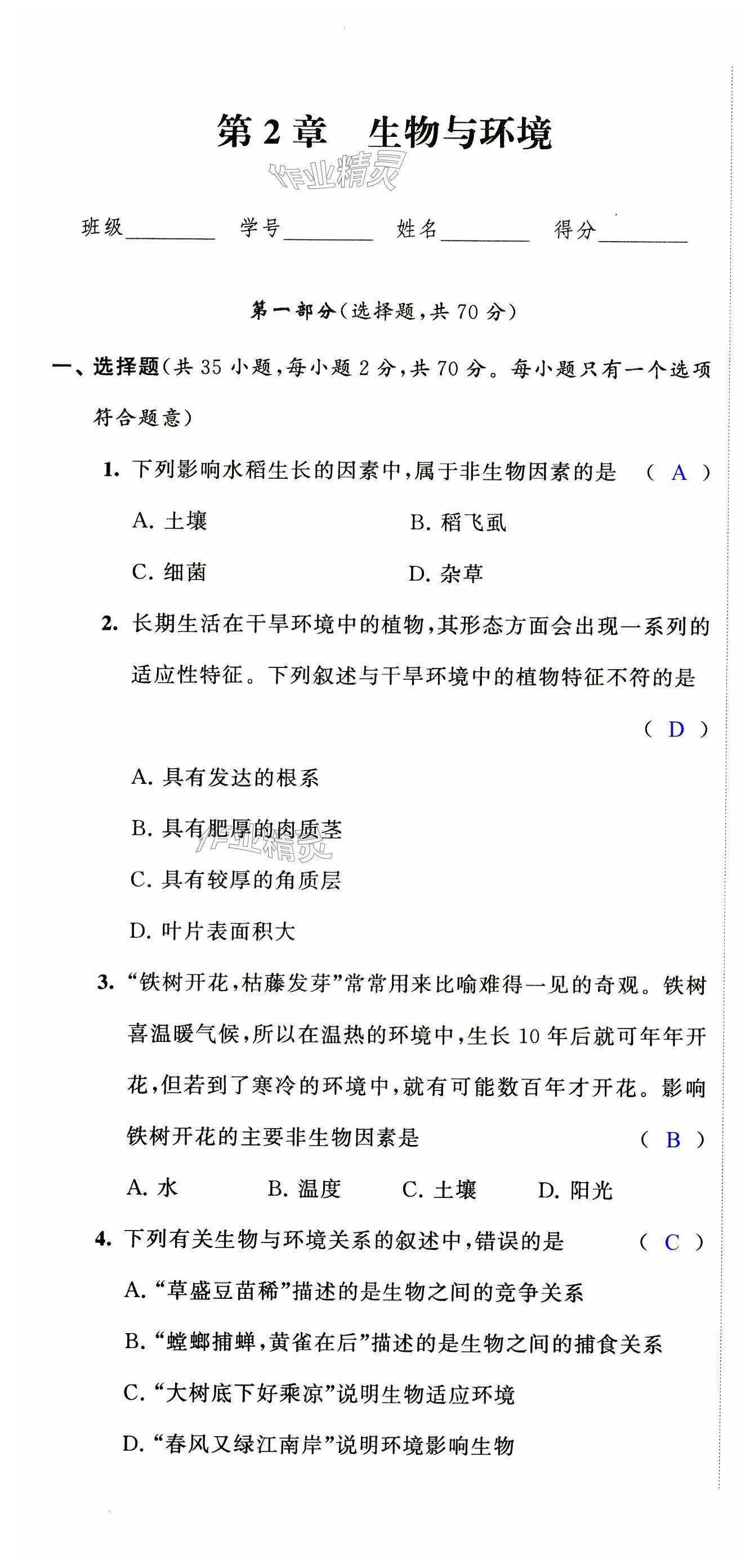 注:目前有些书本章节名称可能整理的还不是很完善,但都是按照顺序排列的,请同学们按照顺序仔细查找。练习册 2024年阳光互动绿色成长空间七年级生物上册苏科版提优版 答案主要是用来给同学们做完题方便对答案用的,请勿直接抄袭。