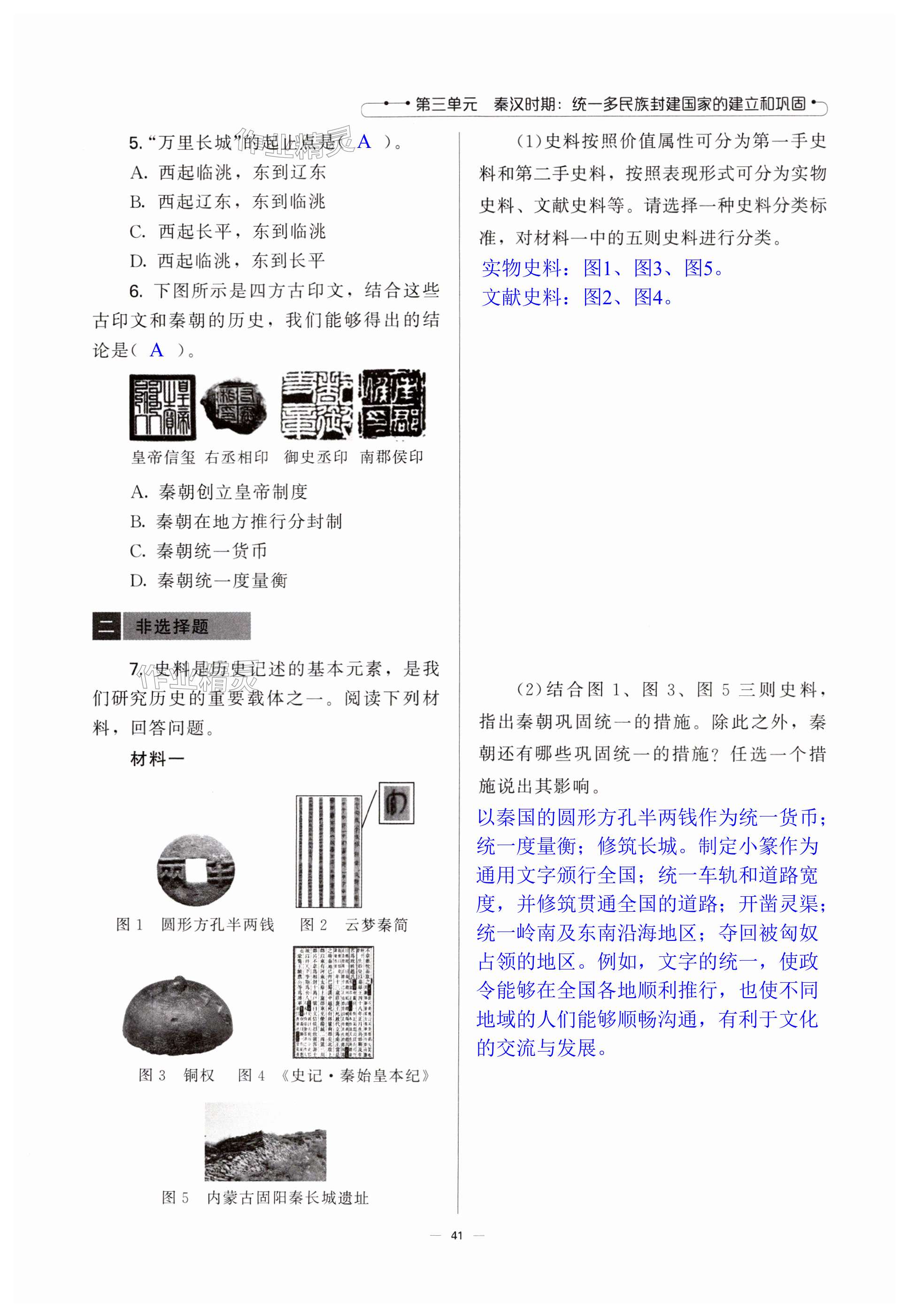 2024年同步练习册北京师范大学出版社七年级历史上册人教版
