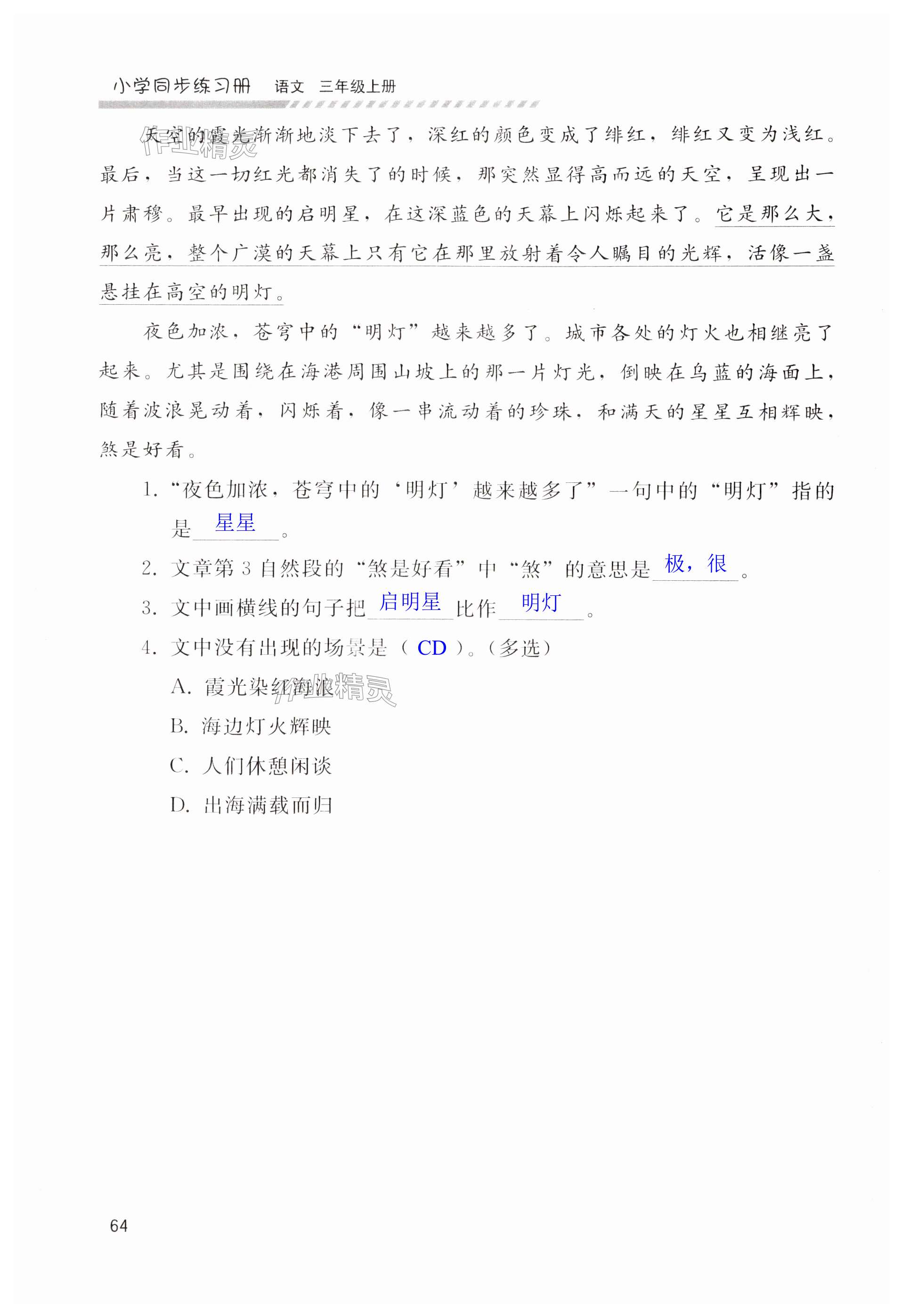 注:目前有些书本章节名称可能整理的还不是很完善,但都是按照顺序排列的,请同学们按照顺序仔细查找。练习册 2024年同步练习册人民教育出版社三年级语文上册人教版山东专版 答案主要是用来给同学们做完题方便对答案用的,请勿直接抄袭。