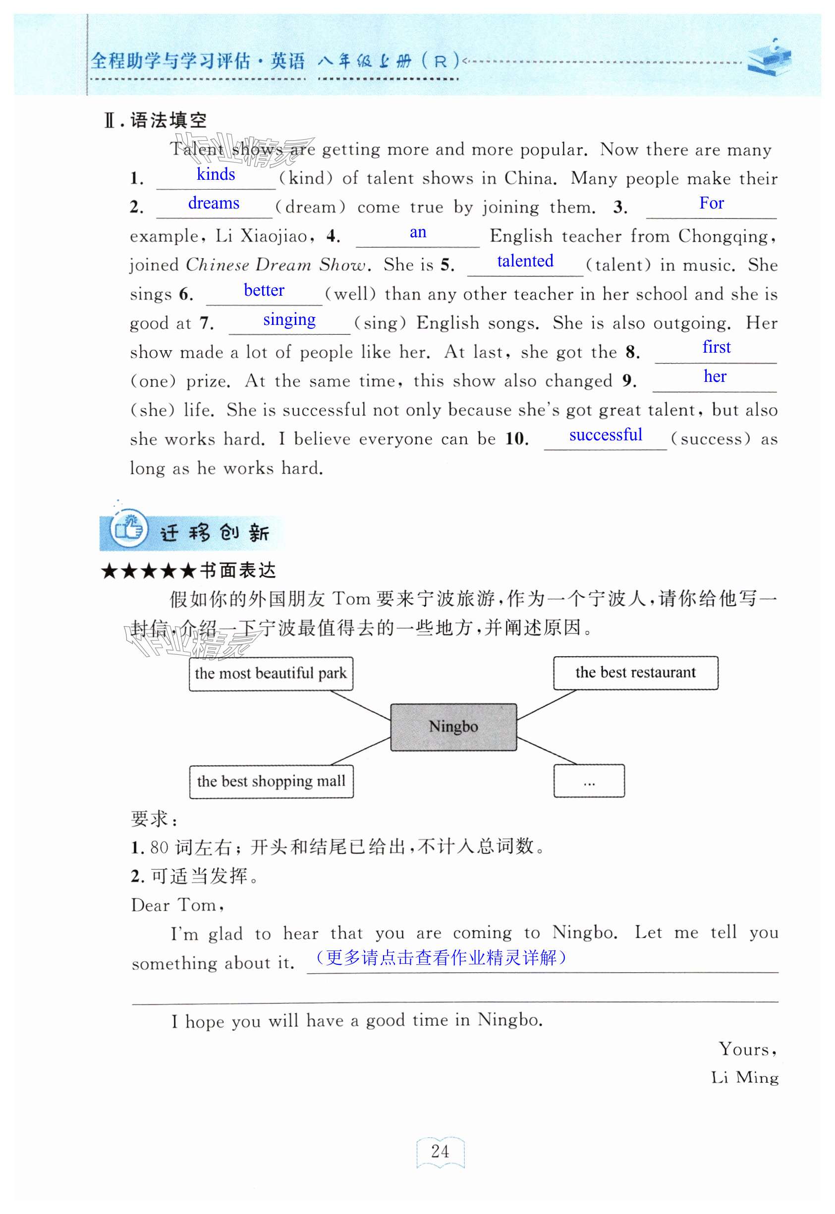 注:目前有些书本章节名称可能整理的还不是很完善,但都是按照顺序排列的,请同学们按照顺序仔细查找。练习册 2024年全程助学与学习评估八年级英语上册人教版 答案主要是用来给同学们做完题方便对答案用的,请勿直接抄袭。