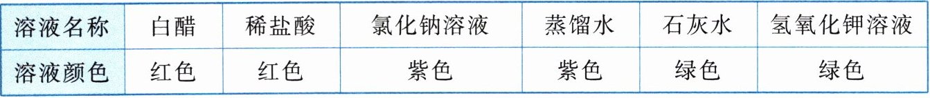 |溶液名称|白醋|稀盐酸|氯化钠溶液|蒸馏水|石灰水|氢氧化钾溶液|