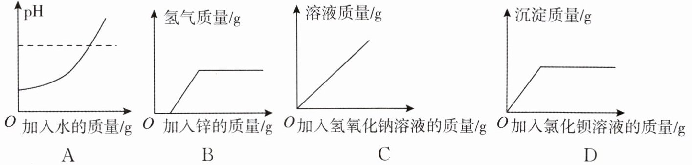4. 向一定量的硫酸溶液中,分别加入足量的水、金属锌、氢氧化钠溶液、氯化钡溶液,如图所示正确的是( )