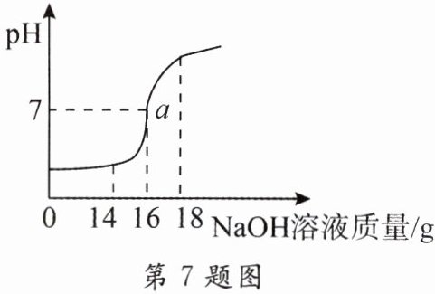 7. 将 $ 5\% $ 的 $ NaOH $ 溶液逐滴加入 $ 10g $ 稀盐酸中,边加边搅拌,随着 $ NaOH $ 溶液加入,溶液 $ pH $ 的变化如图所示。请回答: