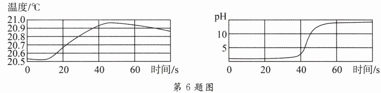 6. 实验小组用传感器探究 $ NaOH $ 溶液与稀盐酸反应过程中温度和 $ pH $ 的变化,测定结果如图所示。下列说法错误的是( )
