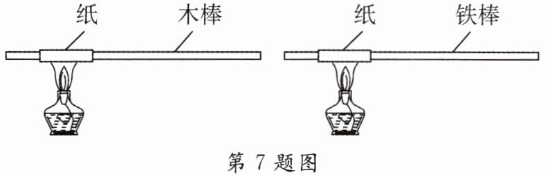 7. 小科将纸条分别紧紧卷在木棒和铁棒上,加热纸条(如图所示),木棒上的纸条立即燃烧,而铁棒上的纸条不会立即燃烧。据此推测木棒和铁棒具有不同的( )